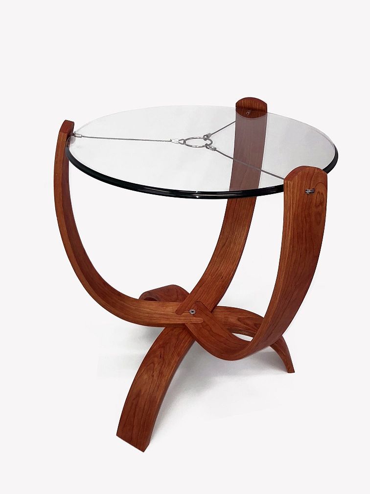 We have our advanced students design and build a 3-legged (or fewer legs) stool during the first two weeks of class. When 3 legs need to be connected with a stretcher there are only a few options. You can run stretchers from leg to leg around the perimeter. You can bring stretchers to the middle, pin wheeling them to each touch the other two. You could bring them into a center hub piece. The simplest way at first could bring them to meet at the very center, except there is only a small area of intersection you can make a 3-way joint within. A 3-layer "stack" would work, but removes 2/3 the thickness off each stretcher, and leaves the center piece needing to be cut on both sides or from the top. My 3-way interlock maximizes glue surface area, maintains through-grain structure. vertical stiffness, and still locks the three elements together within that small area. You cut the same profile on the ends of each piece from the top. This pattern can be scaled up or down to match the width of your stretchers, and is only limited in height, diameter, or by the length of the bit you'll use to cut it. One application for it:  |